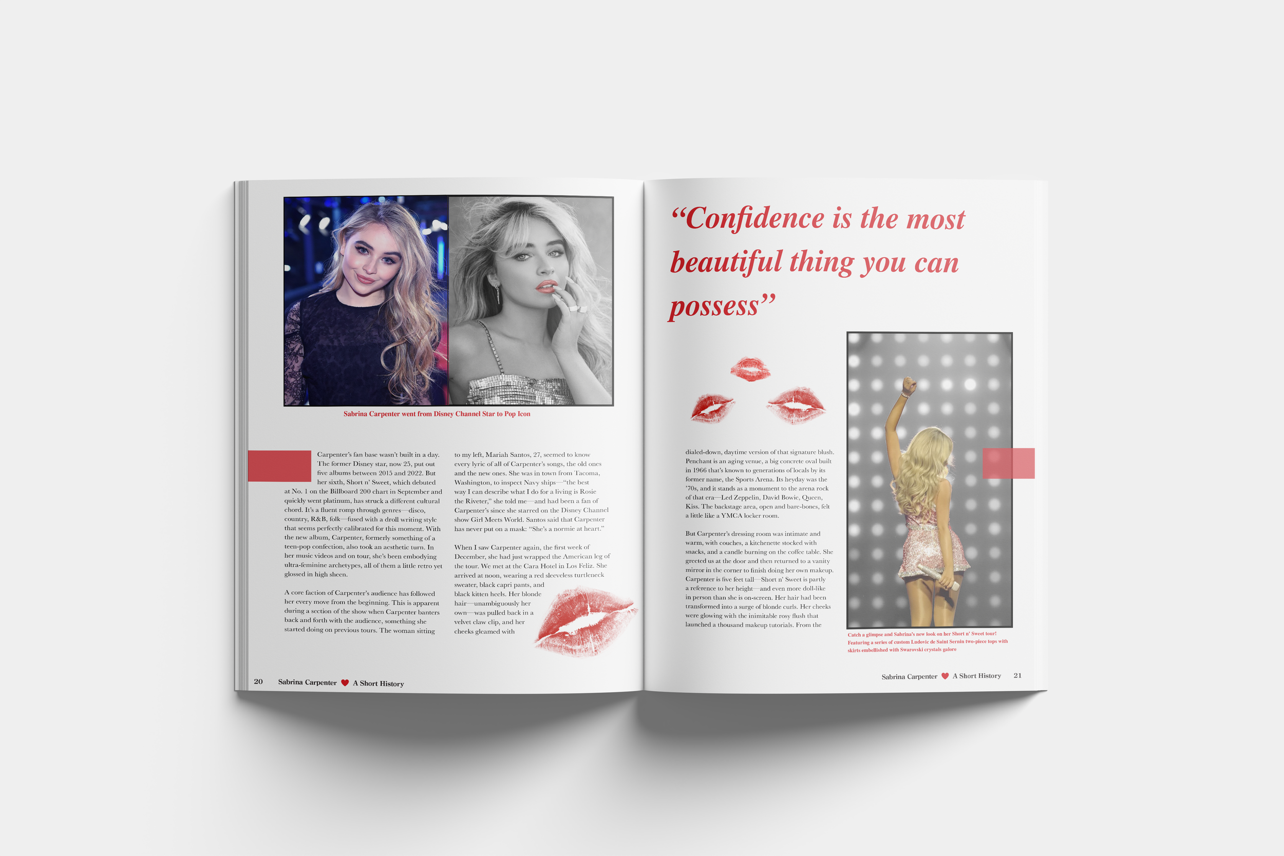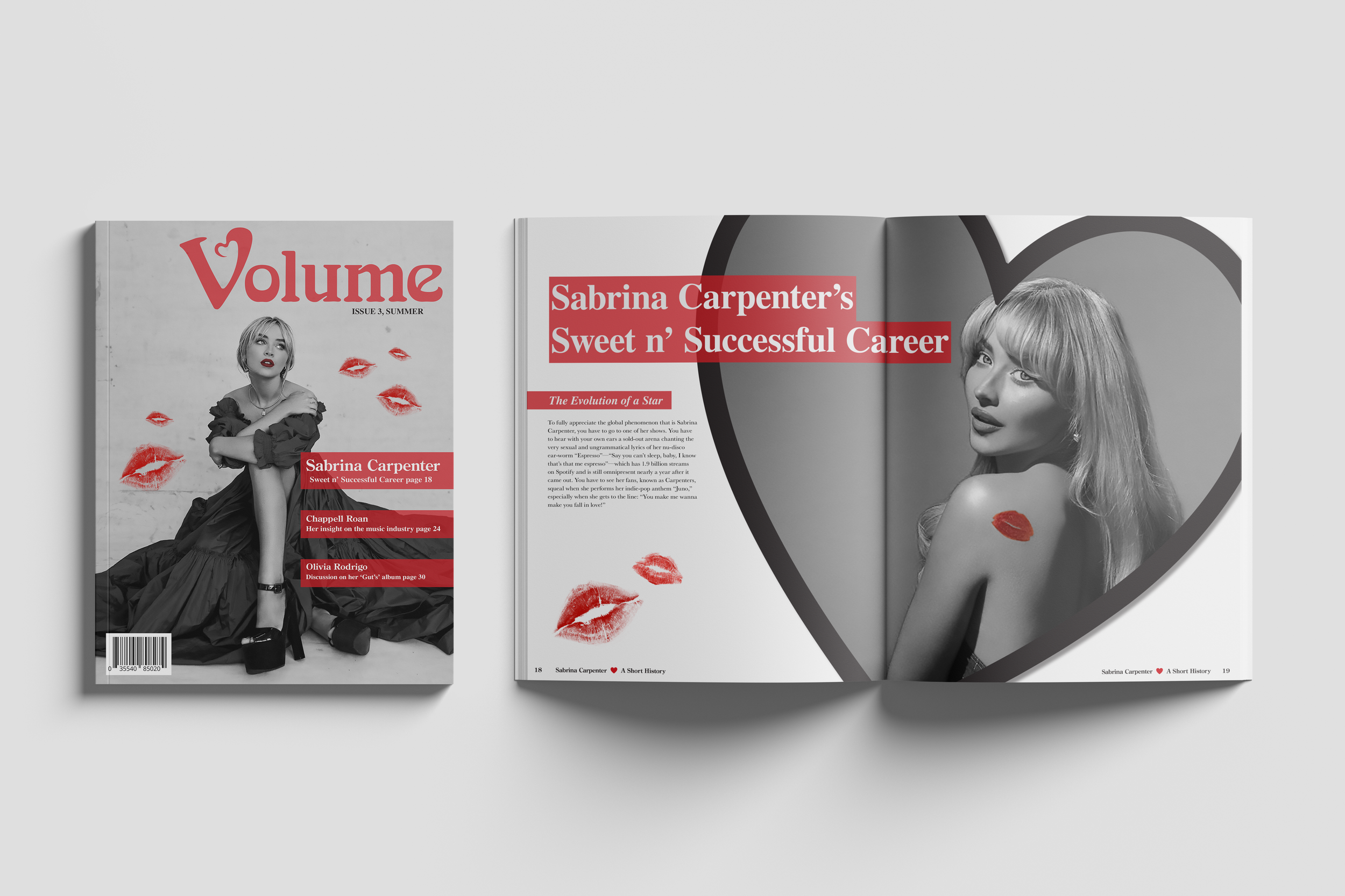 For this assignment, I was to create one of three new magazine designs with content and design that work well for the print version. I picked the artist Sabrina Carpenter to publish my magazine aboutand I had to submit a masthead design, a sample cover design, and a sample 6-page (3 spreads) article design.