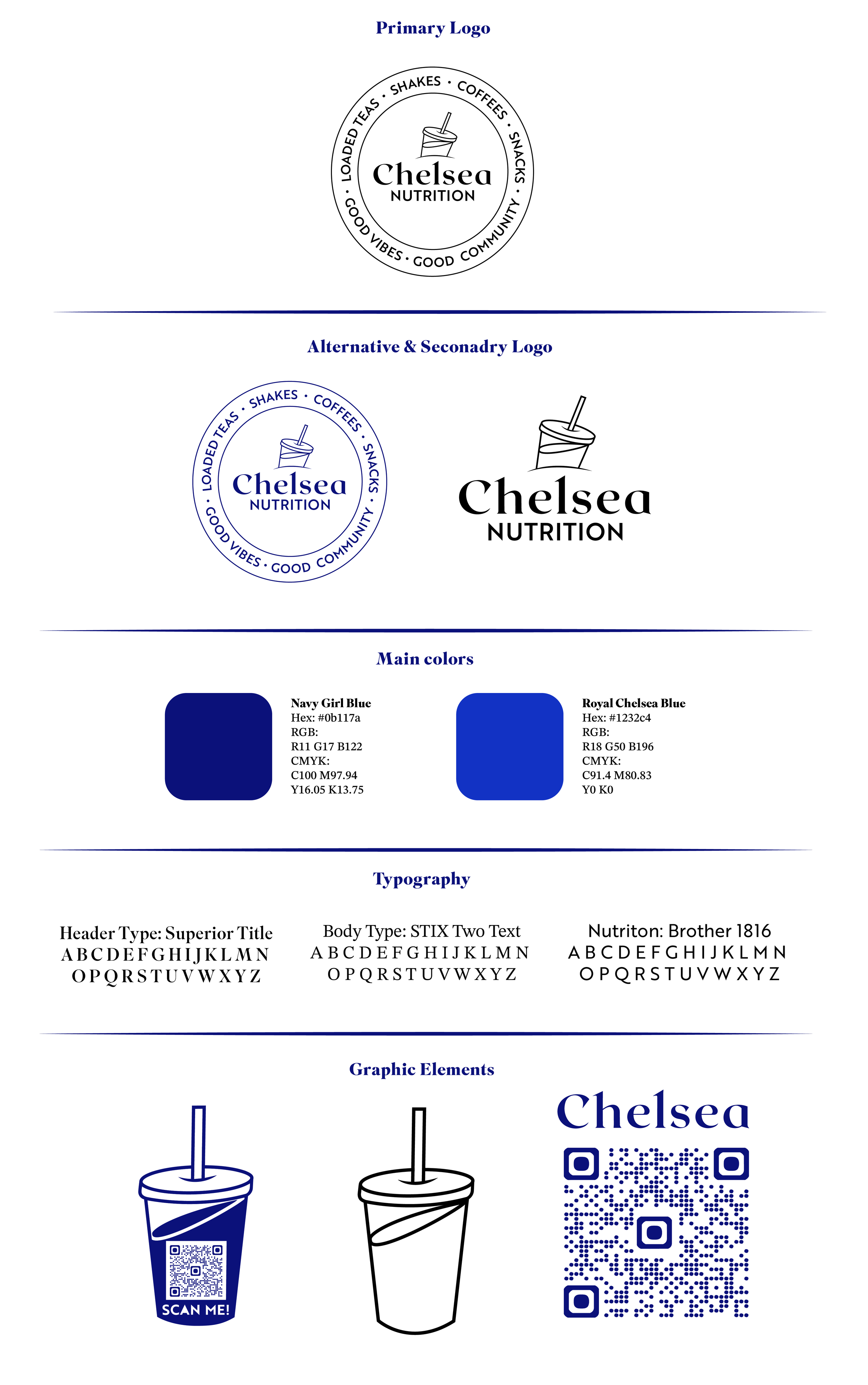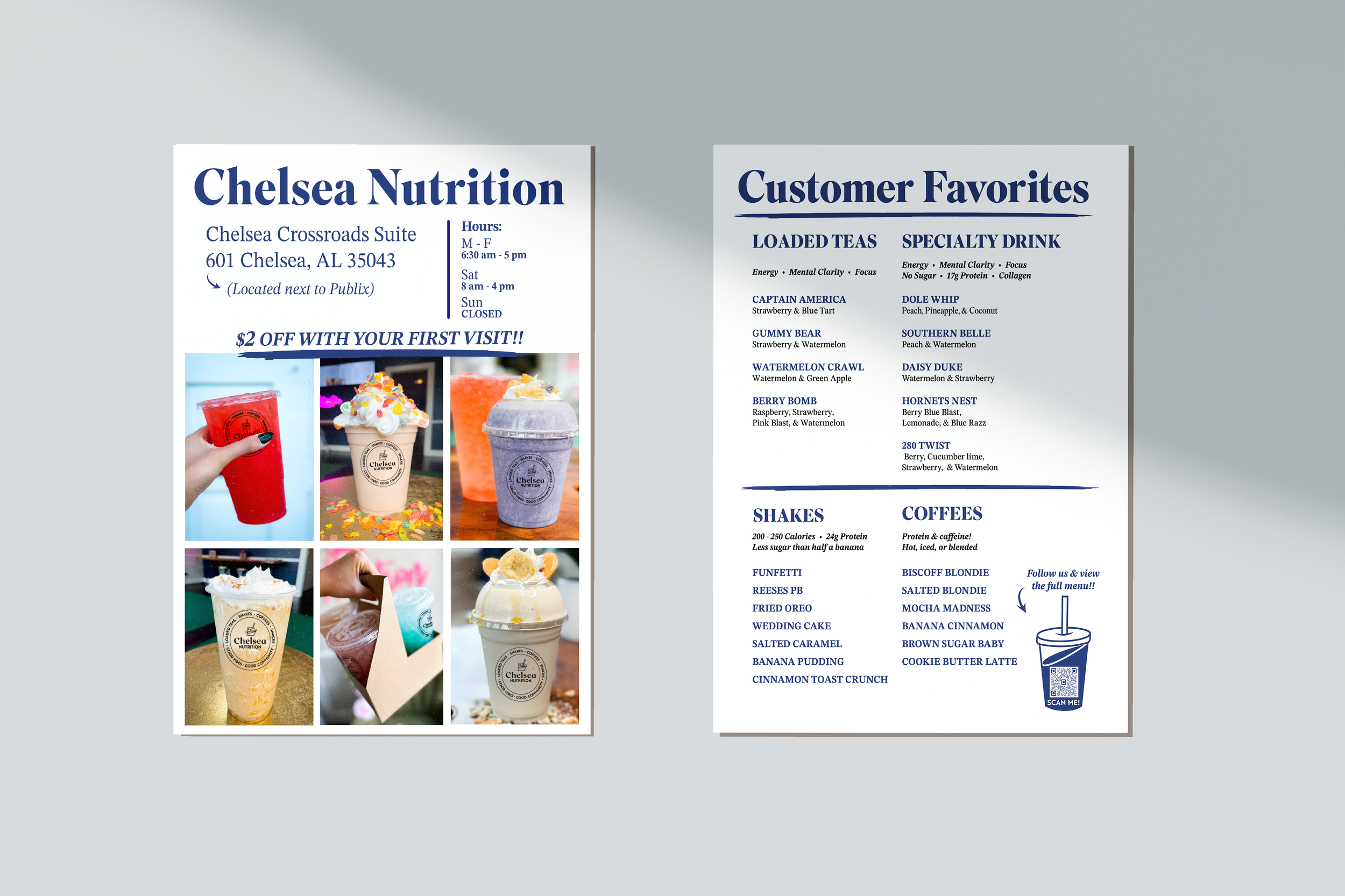 For this client, I was tasked with rebranding the logo for her nutrition shop and designing an 8 ft × 4 ft wall menu. I developed both primary and secondary logos, along with color variations and promotional flyers. The goal was to create a modern, versatile identity that could easily be adapted for applications like cup stickers and other store materials.